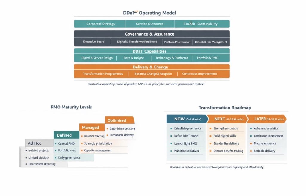 This assignment involved a detailed maturity assessment across functions, the design of a future-state operating model, development of a clear and prioritised roadmap, and practical restructure recommendations. The work supported senior leaders in strengthening governance, clarifying accountabilities, and building the foundations for a modern, sustainable DDaT function aligned to public-sector best practice.